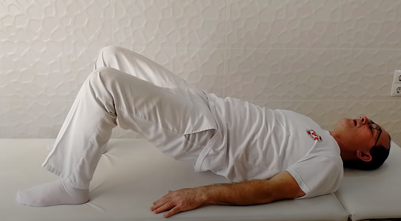 Połóż się na plecach, tak aby nogi były zgięte w kolanach. Ręce połóż wzdłuż ciała blisko miednicy. Staraj się podnieś miednicę, jeśli to nie będzie możliwe z powodu zbyt dużego bólu, możesz tylko przycisnąć ją do podłogi i puść. Wykonaj ćwiczenie w od 15 do 20 powtórzeń. Podnieś miednicę maksymalnie podczas wydechu.