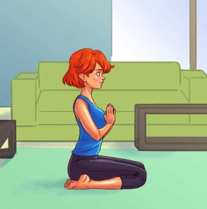 Instrukcje: Usiądź na kolanach, rozluźnij nogi i umieść pośladki pomiędzy piętami na podłodze. Nogi powinny być rozstawione na szerokość bioder. Następnie umieść dłonie złożone jak do modlitwy na wysokości klatki piersiowej. Wyprostuj plecy, rozciągnij szyję i wypnij klatkę piersiową. Głęboko oddychaj. Czas: 1 minuta. Efekt: Poprawa ruchomości bioder i zmniejszenie ich bólu, rozciągnięcie mięśni lędźwi i nóg.