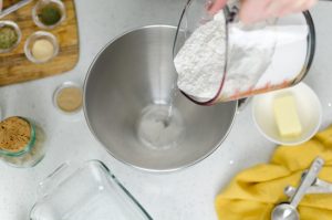 Do miski wsyp mąkę. Dodaj sól i cukier.
