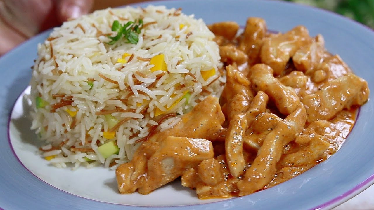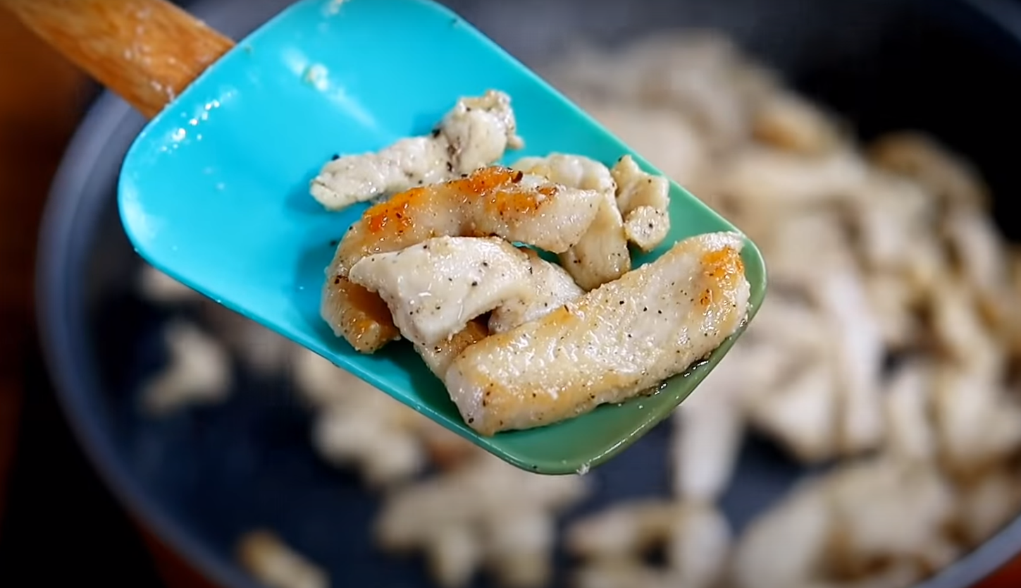 Pierś z kurczaka umyj, osusz i pokrój w cienkie paski. Wlej trochę oleju na patelnię, podgrzej i dodaj kurczaka. Dodaj sól, pieprz i smaż na złoty kolor. Następnie zdejmij mięso z patelni, aby przygotować sos.
