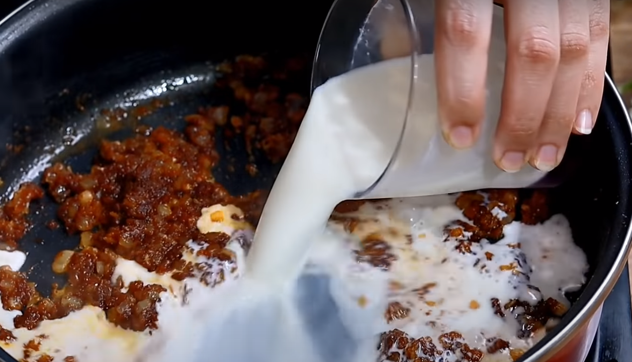 Na patelnię dodaj masło i drobno posiekaną cebulę. Podsmaż do zeszklenia, dodaj mąkę i dokładnie wymieszaj. Następnie dodaj przecier pomidorowy i wymieszaj. Wlej szklankę mleka, szklankę bulionu i wymieszaj do uzyskania zwartej konsystencji bez grudek.