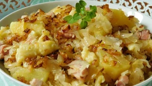 W końcowym kroku mieszamy ziemniaki z kluskami i okraszamy je boczkiem z cebulką. Na sam koniec siekamy drobno surową kapustę kiszoną i posypujemy ją danie.  Życzymy smacznego!