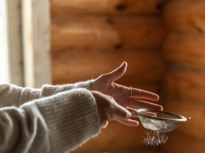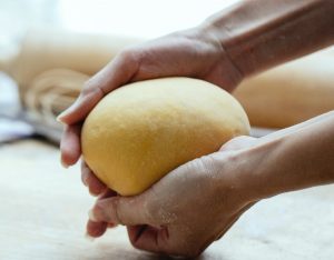 Wmieszać w ciasto. Posyp blat mąką. Ciasto wyłożyć na stolnicę i rozwałkować.