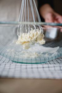 Wymieszaj biały jogurt. Dodać przesianą mąkę i proszek do pieczenia. Dobrze mieszamy, aby uzyskać jednolitą masę – ciasto.