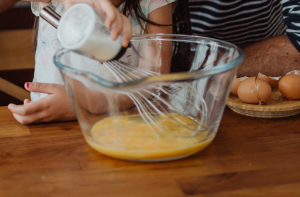 Dodać cukier cukier waniliowy i szczyptę soli. Dodać olej i wymieszać. Mieszamy na jednolitą masę.