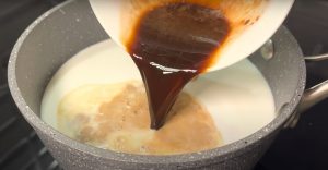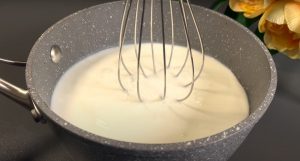 Zacznij od rondla o grubych ściankach. Wlej mleko do garnka, dodaj 100 g cukru i postaw na ogniu.