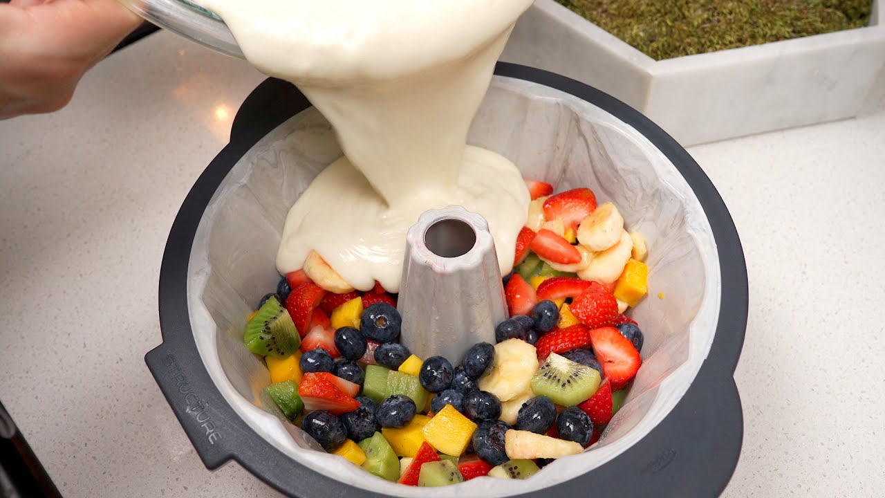 Wszystkie owoce pokrój na małe kawałki. Banana pokrój w kółka i skrop sokiem z cytryny. Wszystkie owoce włóż do foremki do ciasta (formę posmaruj masłem lub wyłóż folią, możesz wybrać formę silikonową- dzięki temu będzie łatwiej wyjąć deser z formy).