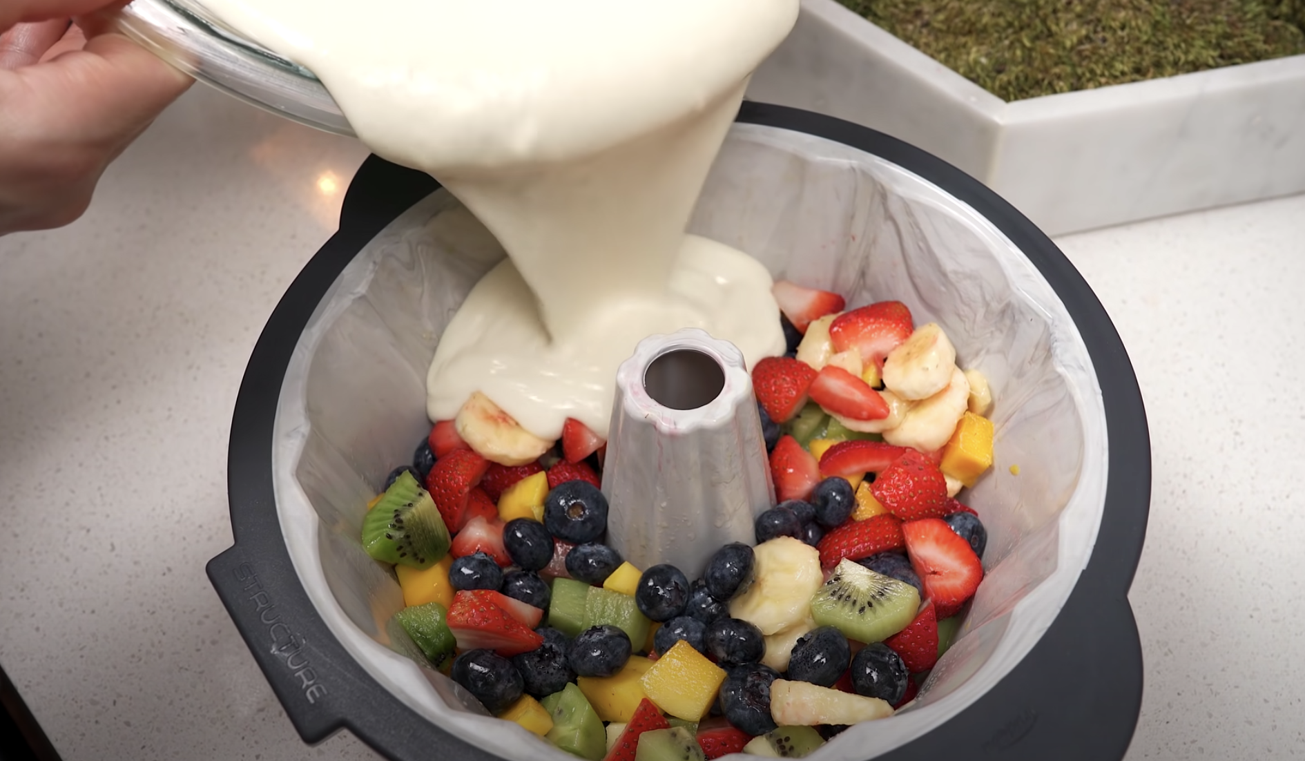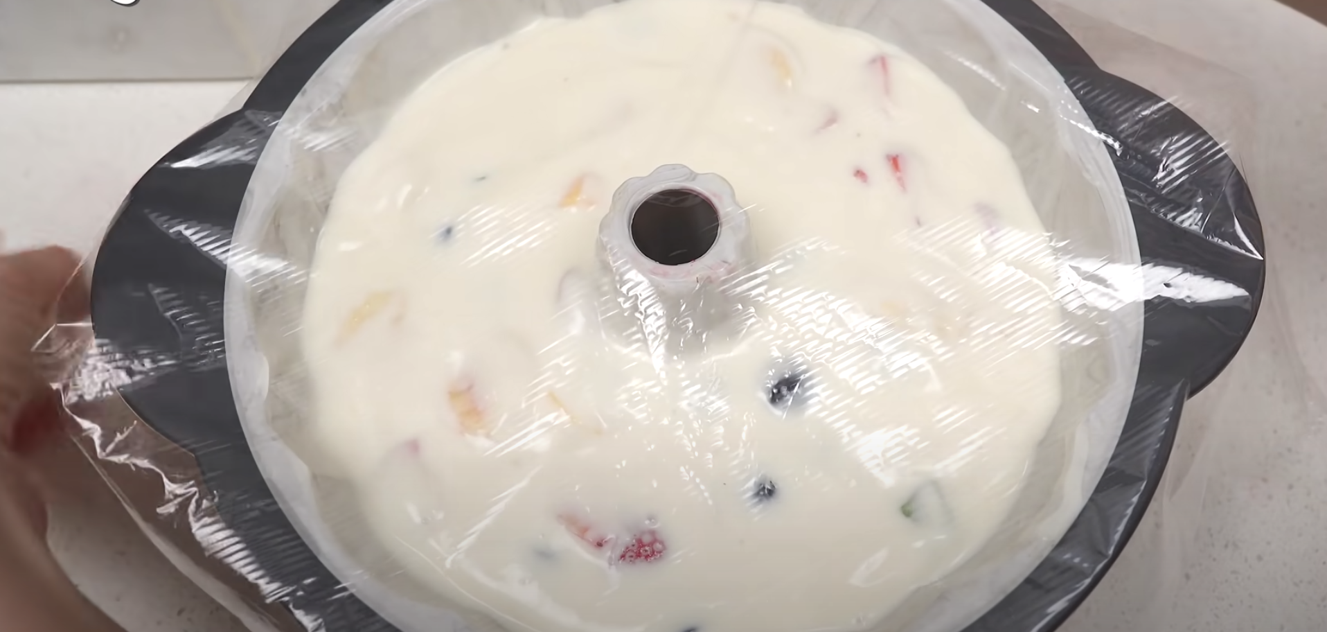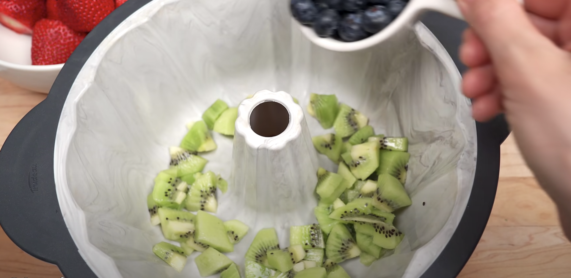 Wszystkie owoce pokrój na małe kawałki. Banana pokrój w kółka i skrop sokiem z cytryny. Wszystkie owoce włóż do foremki do ciasta (formę posmaruj masłem lub wyłóż folią, możesz wybrać formę silikonową- dzięki temu będzie łatwiej wyjąć deser z formy).