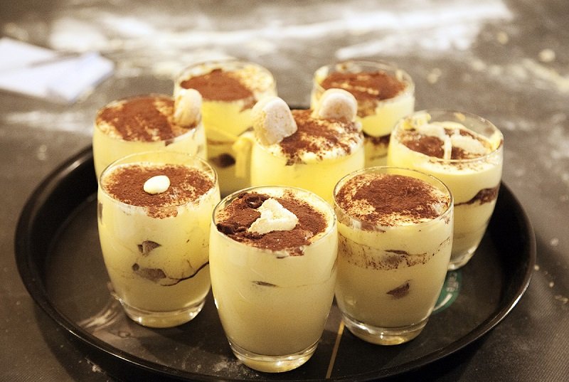 W tym czasie ubij serek mascarpone z mlekiem skondensowanym na gęstą masę. Przyszykuj pucharki, ich spód wyłóż nasączonymi biszkoptami, następnie włóż masę z mascarpone i wierzch posyp kakao. Gotowe!