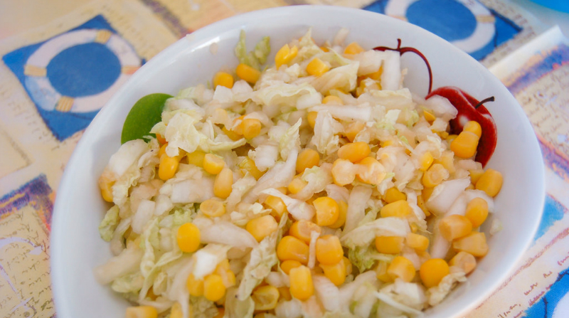 Najpierw należy pokroić 200 g młodej kapusty, a następnie jedno jabłko pokroić w paski lub bardzo cienkie plasterki. Do sałatki dodajemy dwie lub trzy łyżki kukurydzy. Całość należy skropić octem jabłkowym i olejem, a na koniec doprawić solą oraz wymieszać.
