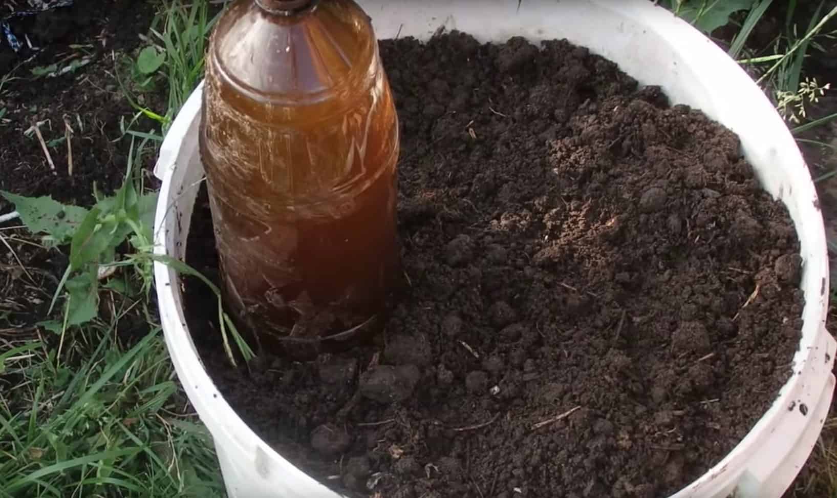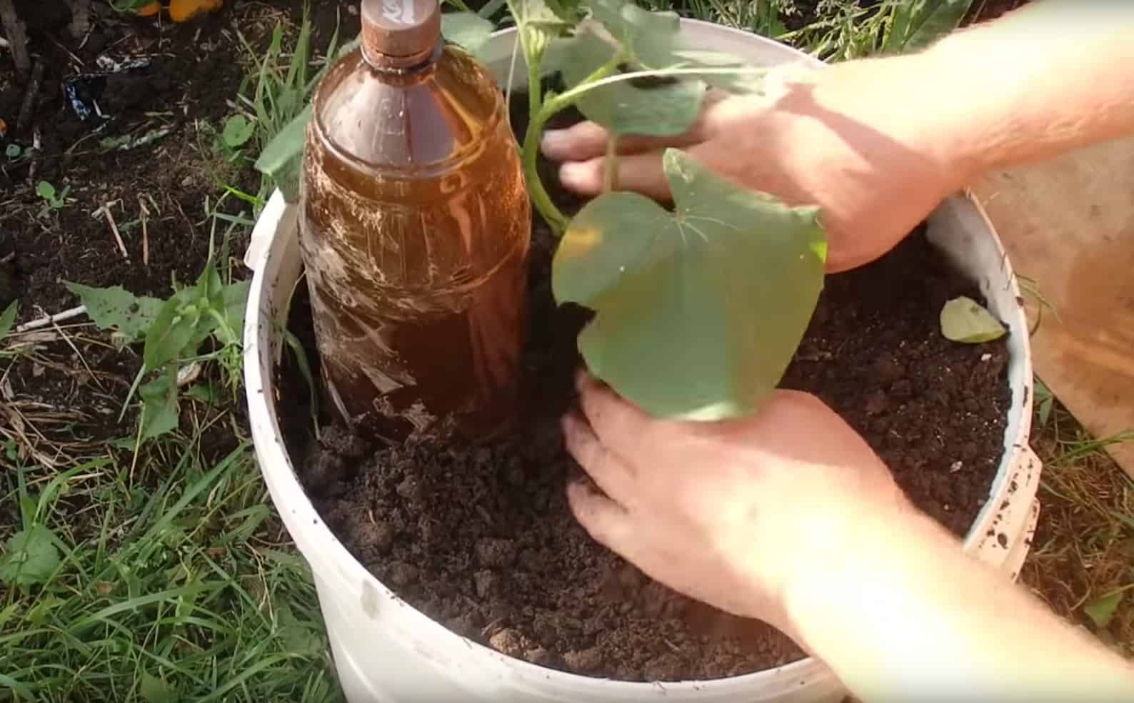 Obok butelki wykop dołek o głębokości 10 cm i delikatnie włóż do niego sadzonkę ogórka. Przysyp sadzonkę i dociśnij glebę dookoła niej.