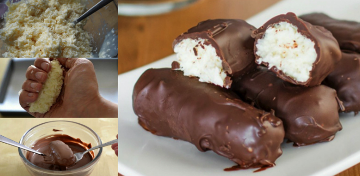 Po schłodzeniu kokosowego nadzienia, roztop czekoladę mleczną w kąpieli wodnej. Każdy z batoników zanurzaj w roztopionej czekoladzie. Oblane czekoladą batoniki umieść na kilka minut w lodówce, aby polewa mogła zastygnąć.