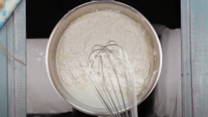 Następnie przygotuj krem: Cukier i budyń w proszku rozprowadź w mleku. Włącz grzanie i zagotuj całość, aż zgęstnieje.