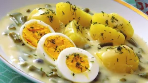 Na 4 porcje potrzebne będzie 500 g świeżej zielonej fasolki , 500 ml bulionu z kurczaka lub wołowiny, 250 ml śmietany do ubijania (temperatura pokojowa), 1 łyżka oleju, 1 ząbek czosnku, 1 łyżka cukru pudru, sól i pieprz. Do smaku można dodać odrobinę octu lub świeżego koperku. Na każdą porcję odlicz 1 jajko na twardo lub na twardo i około 100-150 g gotowanych ziemniaków.