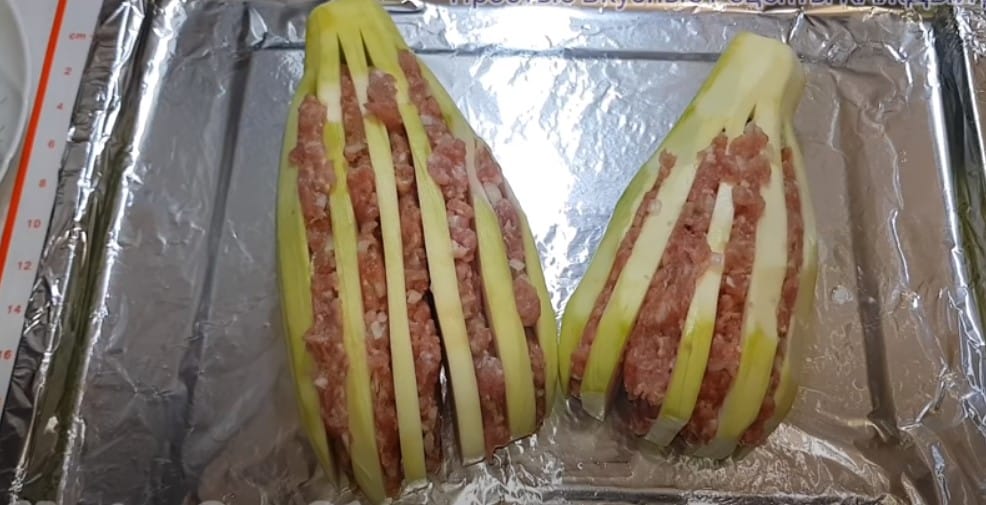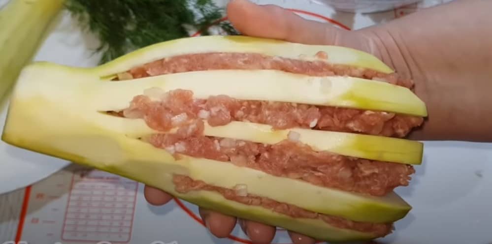 Przerwy między płatami cukinii wypełnij powstałą mieszanką z mięsem.