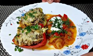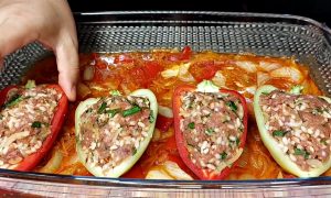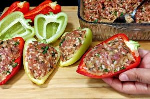 Papryka faszerowana po turecku z mieszanką mięsną zapiekaną na warzywach – sposób przygotowania