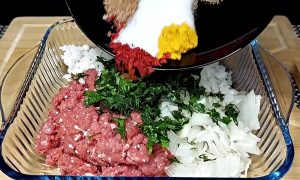 Mięso mielone przełóż do naczynia żaroodpornego, dodaj drobno posiekaną cebulę, ugotowany ryż i posiekane świeże zioła. Posyp solą, pieprzem, kurkumą, słodką papryką, mieloną kolendrą i mielonym kminkiem i dokładnie wymieszaj wszystkie składniki.