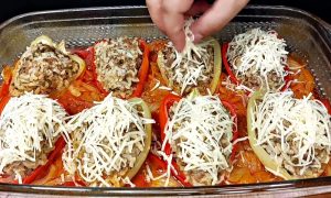 Po 45 minutach pieczenia odkryj blachę i posyp papryki startym serem, który lubisz. Następnie ponownie włóż je z powrotem do piekarnika, aby dokończyć pieczenie przez kolejne 10 minut, aby ser na powierzchni się rozpuścił i zrobił się lekko czerwony.