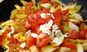 Posyp je solą i pieprzem i smaż dalej. Pokrój ogonki kapusty pekińskiej w średniej wielkości kwadraty, dodaj je do mieszanki warzywnej na patelni i dodaj łyżkę koncentratu pomidorowego. Całość mieszamy, dodajemy pokrojone pomidory i pokrojony w plasterki czosnek i smażymy jeszcze kilka minut, często mieszając. Wlej wodę na mieszaninę na patelni, zamknij pokrywkę i gotuj na wolnym ogniu przez 5 minut.
