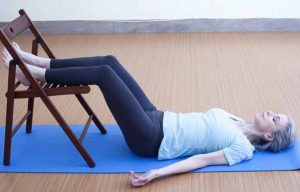 Leżąc na podłodze, unieś nogi i połóż je na siedzisku krzesła. Ćwiczenie odciąża kręgosłup i poprawia krążenie, co może być korzystne w walce z żylakami. Doskonały relaks na zakończenie ćwiczeń, na około 10 minut lub dłużej, jeśli czujesz się dobrze w tej pozycji.