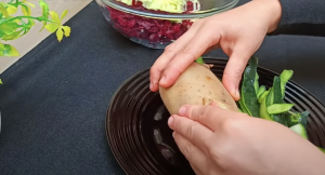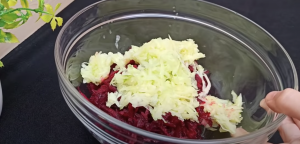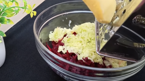Dodaj do startego buraka. Dodajemy również obrane i ugotowane ziemniaki, które ścieramy na tarce.