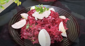 Sałatkę podajemy z jajkiem ugotowanym na twardo, które kroimy w ćwiartki. Możemy również podać z kwaśną śmietaną lub majonezem.