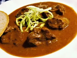 Wołowinę pokroić na kawałki. Obierz i drobno posiekaj cebulę. Mięso z cebulą włożyć do wysmarowanej tłuszczem formy do zapiekania (nie ma znaczenia czy naczynie jest szklane czy teflonowe, gulasz musi być przykryty), wymieszać z przyprawami. Rozpuścić masę wołową w niewielkiej ilości wrzącej wody, a następnie dodaj 1 litr wrzącej wody.