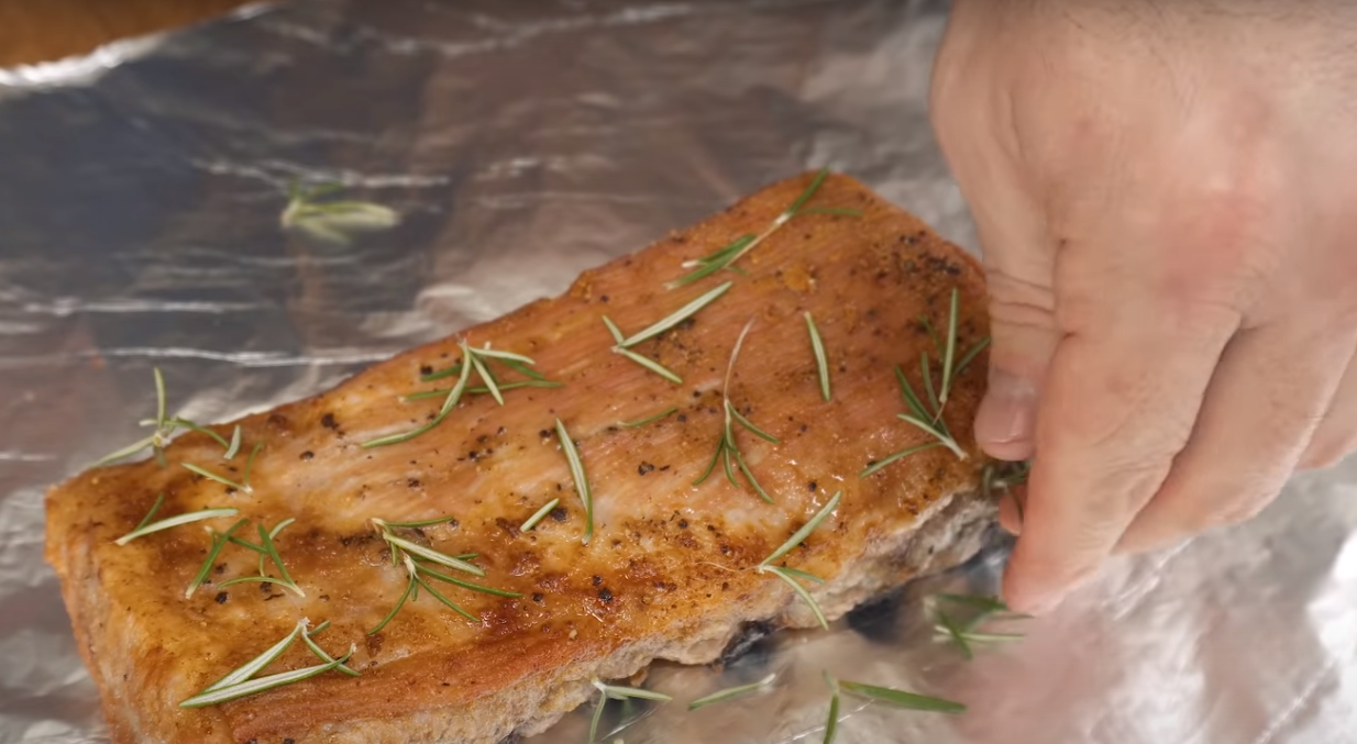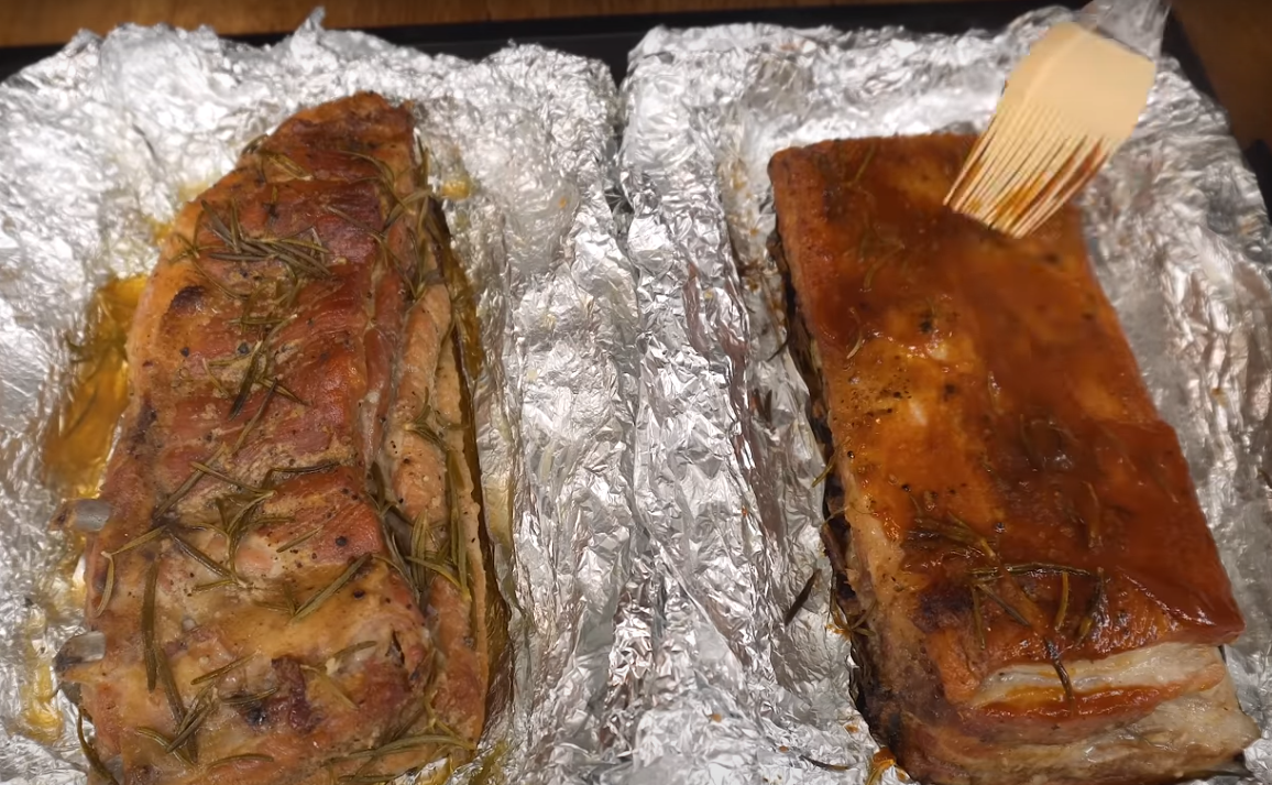 Przykryj blachę folią i umieść na niej mięso. Żeberka piecz około 30 – 40 minut w temperaturze 200 ° C. Następnie wyjmij blachę, posyp mięso rozmarynem, zawiń w dwie warstwy folii i piecz kolejne 50 – 60 minut.
