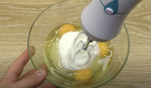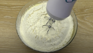 Na zakończenie, wsypać przesianą mąkę wymieszaną z łyżeczką proszku do pieczenia, zagnieść ciasto do uzyskania jednolitej konsystencji.