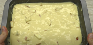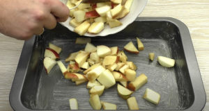 Jabłka należy położyć na wysmarowanej masłem blasze do pieczenia o wymiarach 21×31 cm. Następnie przykryć je przygotowanym ciastem i wygładzić.