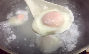 Metoda trzecia: Zagotuj wodę w głębokiej patelni, a w nasmarowanej olejem chochli wbij jajko. Gotuj, dopóki białko się nie ścięgnie, a potem zanurz jajka w wodzie na 3 minuty.