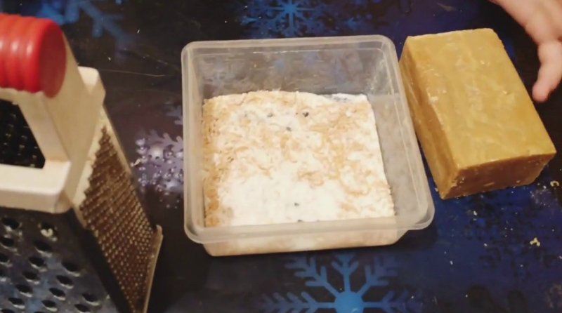 Na początku należy zetrzeć mydło na tarce. Powinno się użyć do tego celu drobnych dziurek. Po starciu kostki, dodać gorącą wodę i wymieszać.