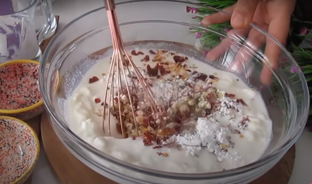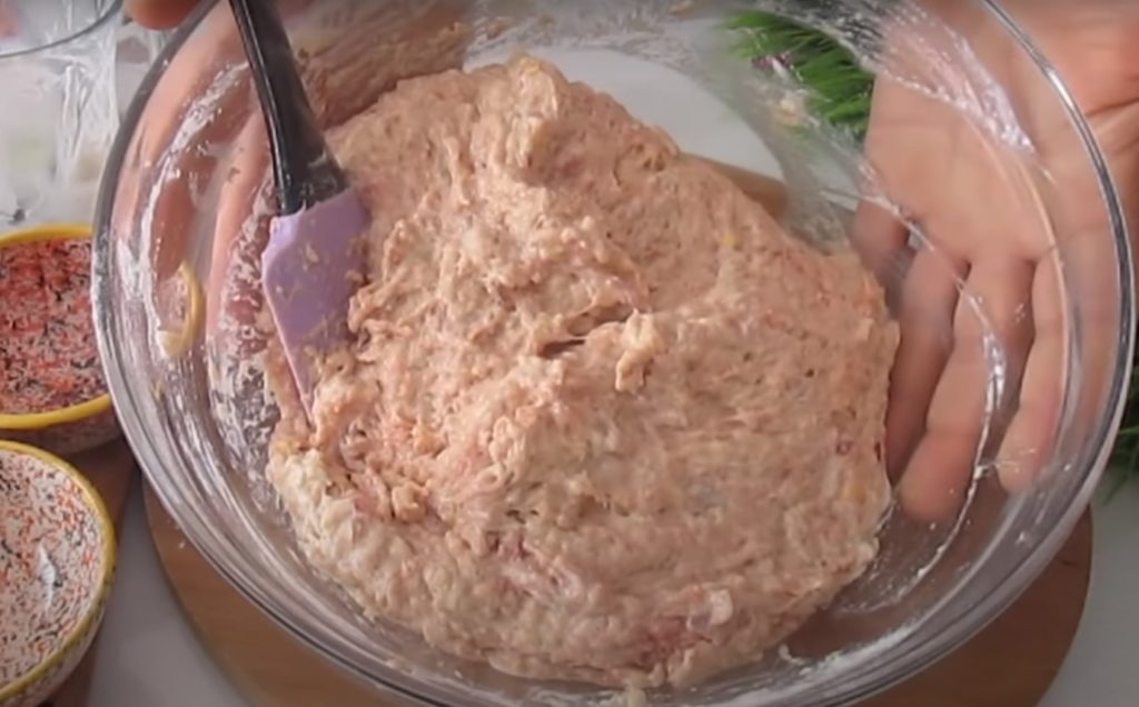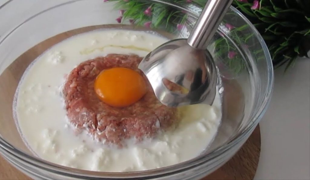 Wlej mleko do miski, dodaj jogurt i dobrze wymieszaj. Następnie dodaj mięso mielone, jajka, przeciśnięty przez praskę czosnek, ostrą paprykę lub chili, tymianek, sól, proszek do pieczenia. Wszystko dobrze wymieszaj.