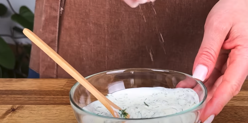 Drobno posiekaj pęczek koperku i zetrzyj 1 ogórka kiszonego. W misce wymieszaj 3 łyżki jogurtu greckiego, koperek, ogórka kiszonego, szczyptę soli oraz wyciśnij 1 ząbek czosnku. Dokładnie wymieszaj.