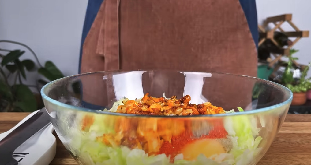 Drobno posiekaj pół główki kapusty i wrzuć do garnka. Zalej wrzątkiem i gotuj przez 5 minut. Odcedź kapustę i pozostaw do ostygnięcia. Drobno posiekaj cebulę i zetrzyj marchewkę na dużych oczkach tarki. Rozgrzej olej roślinny na patelni i smaż cebulę przez 3-5 minut. Dodaj startą marchewkę, wyciśnij 2 ząbki czosnku i smaż razem przez kilka minut.