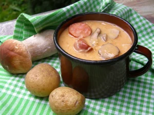Jeśli mamy grzyby, parzymy je w gorącej wodzie i lekko odparowujemy, następnie odcedzamy wodę i dodajemy ją do zupy na samym początku.