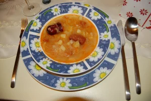 Wędzone i surowe mięso gotujemy w wodzie około 1/2 godziny, następnie dodajemy kapustę, kiełbasę, warzywa korzeniowe, cebulę, całe i mielone przyprawy, 3-4 ząbki czosnku, kminek i gotujemy razem do miękkości.