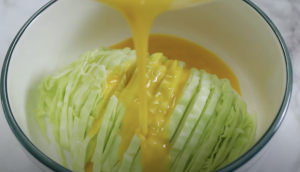 Zetrzyj ser i posiekaj kiełbasę. Kapustę należy odsączyć po wypłukaniu pod bieżącą wodą. W misce ubij dwa jajka z solą i pieprzem, a następnie dodaj je do kapusty.