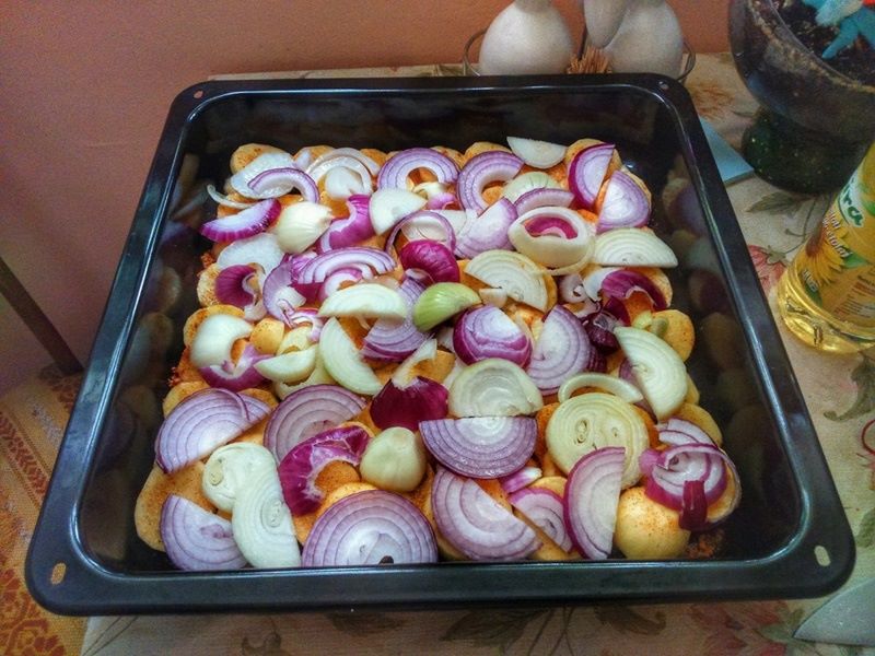 Cebulę pokrój w krążki, a następnie rozłóż je na ziemniakach. To samo zrób z pokrojonym w kostkę boczkiem.