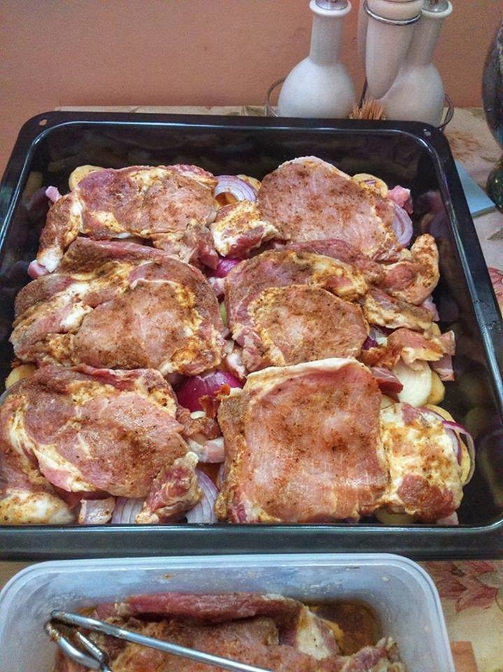 Karkówkę pokrój w plastry i posmaruj je resztą marynaty. Potem wyłóż kawałki mięsa na blachę z resztą składników.