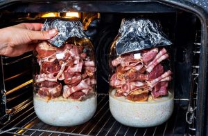 Przygotuj cztery szaszłyki mięsne zgodnie z opisem i włóż je do szklanki, wbijając je w warstwę ryżu na dole. Wierzch słoika przykryć złożonym na pół kawałkiem folii aluminiowej i wstawić słoik do piekarnika nagrzanego do temperatury 180°C, w którym słoik z mięsem i ryżem zapiekać około 50 minut.