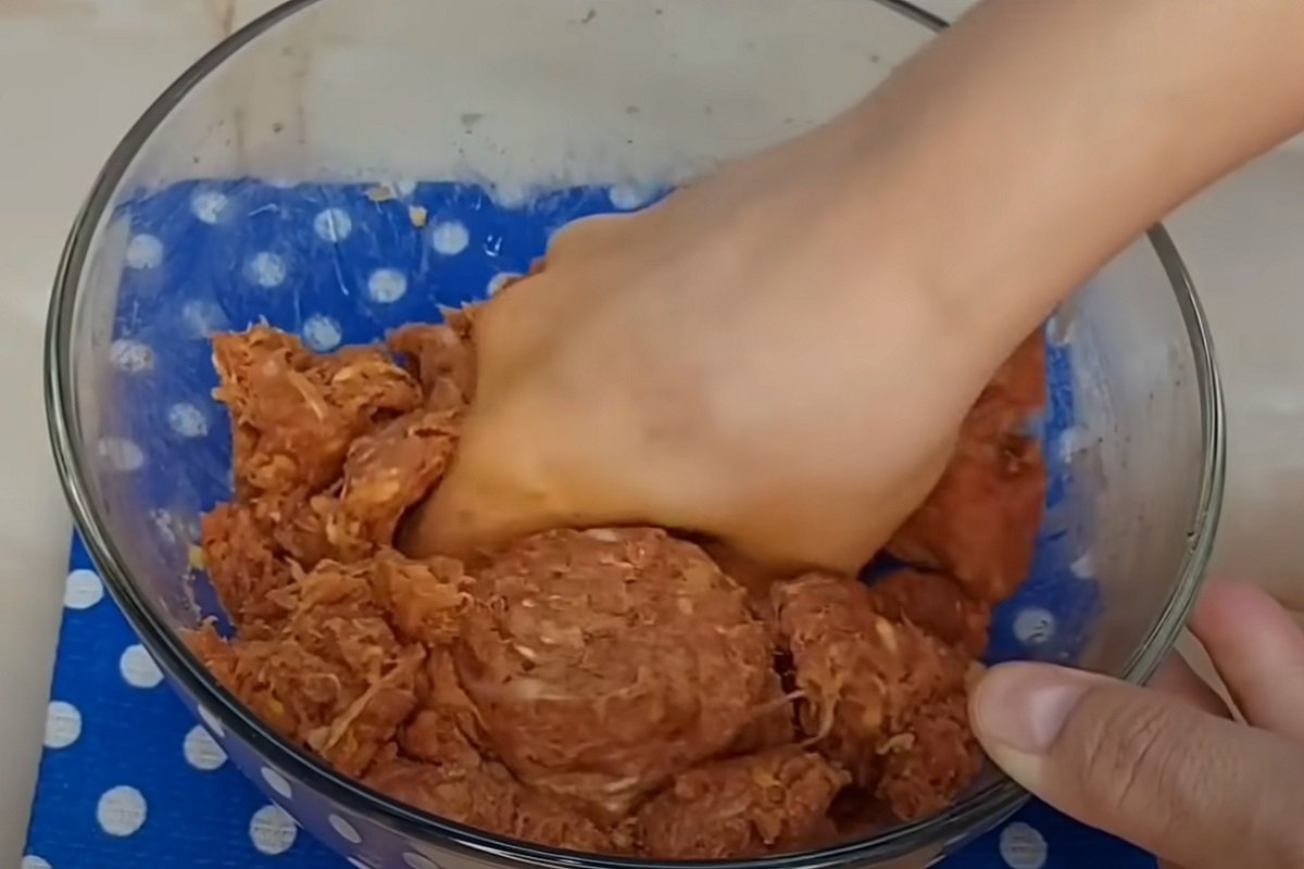 Dodaj zioła, przyprawy i sól. Teraz najważniejsza rzecz: zagnieść mięso mielone do lepkiej, jednolitej konsystencji. Następnie odstaw do lodówki na pół godziny.