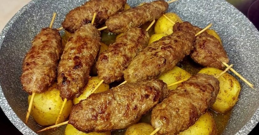 Mięso mielone układamy na patyczkach, nadając mu eliptyczny kształt. Rozciągnij i dobrze ściśnij boki.