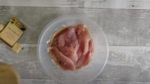 Pierś z kurczaka pokroić na mniejsze i cieńsze kawałki. Do miski włożyć skrobię ziemniaczaną, 3 łyżki oleju, żółtka i jogurt. Następnie dodać suszony czosnek, słodką paprykę, sól, pieprz, płatki chili do smaku i majeranek.