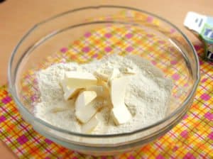 Odmierz 200 gramów mąki. Przesiej ją dokładnie przez sitko do miski. Do mąki dodaj posiekane na drobne kawałki masło i wymieszaj je ze sobą przy użyciu rąk.
