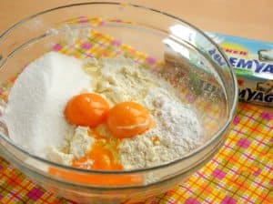 Oddziel żółtka od białek i wlej je do miski. Wsyp do niej także cukier i proszek do pieczenia.