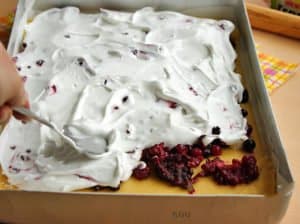 Wlej do miski 4 białka i zacznij je ubijać z cukrem. W trakcie miksowania dodawaj powoli skrobię. Ubijaj pianę z białek do momentu, kiedy będzie sztywna. Uzyskaną piankę wyłóż na wierzch owoców.