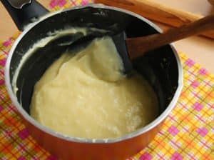 Z tych składników ugotuj krem budyniowy – gotuj, dopóki nie zrobi się gęsty, a następnie odstaw do wystudzenia. Następnie zmiksuj go z masłem, dodając je powoli, łyżka po łyżce.