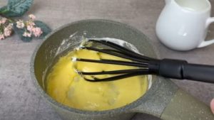 W rondelku wymieszaj żółtka z cukrem, a następnie dodaj skrobię kukurydzianą. Dodać skórkę z cytryny i stopniowo dodawać mleko. Wszystko dokładnie wymieszaj.