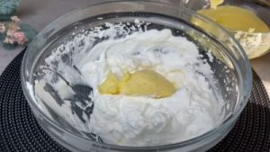 Następnie włóż blachę do piekarnika i piecz ciasto w temperaturze 180°C przez około 15 minut. Następnie wyjmij go z piekarnika i pozostaw do całkowitego ostygnięcia. Śmietanę ubić na sztywną pianę, a następnie podzielić ją na dwie części. Pierwszą część przełożyć do rękawa cukierniczego i odstawić. Stopniowo dodawaj masę żółtkową do reszty ubitej śmietany i ubijaj na gładki krem.